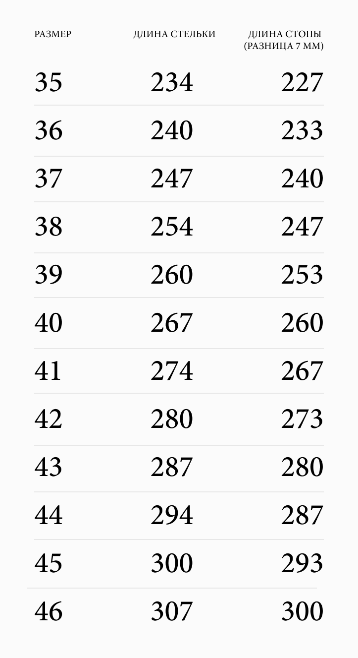 Выберите модель и откройте вкладку «Размерный ряд». По длине стопы (3 столбец) подберите подходящий размер.