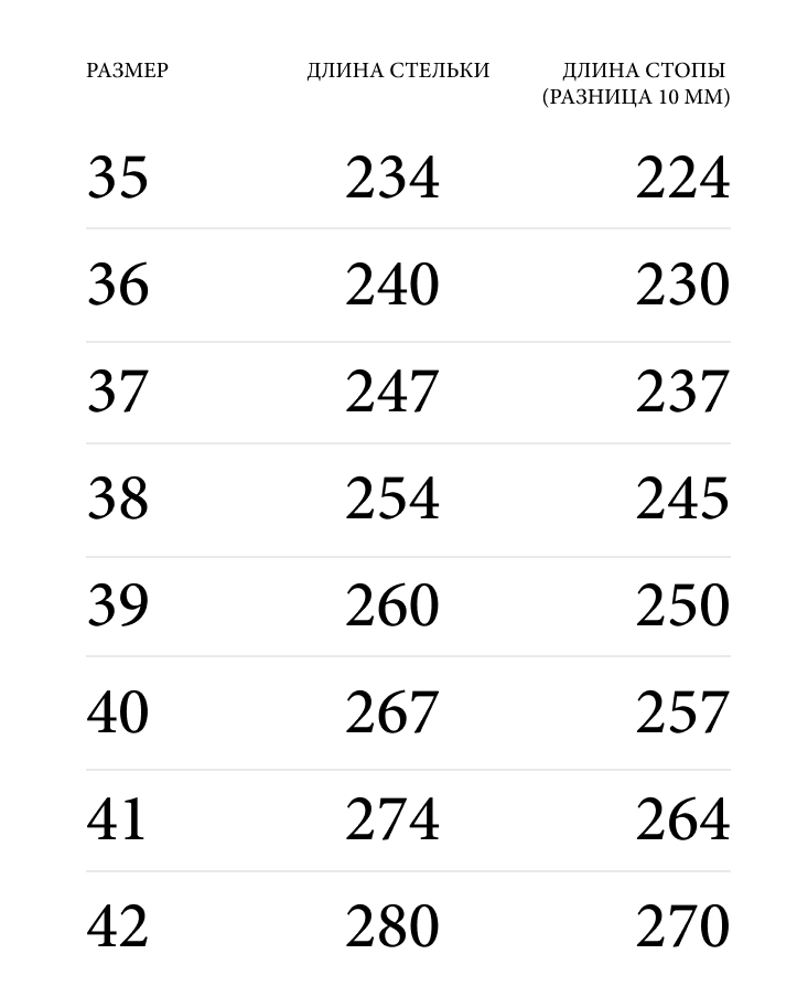 Выберите модель и откройте вкладку «Размерный ряд». По длине стопы (3 столбец) подберите подходящий размер.
