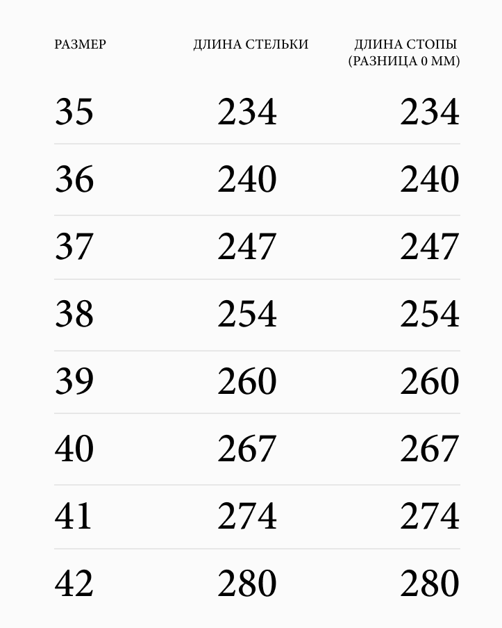 Выберите модель и откройте вкладку «Размерный ряд». По длине стопы (3 столбец) подберите подходящий размер.